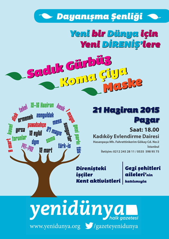 15-16 Haziran İşçi Direnişi'nden TEKEL ve Metal Direnişlerine, 1 Mayıs'lardan Mayıs-Haziran Büyük Halk Direnişine, Maden Ocaklarından Soma-Ermenek ve Torunlar'da Yaşanan İşçi Katliamlarına, Maraş-Çorum-Sivas'tan Dersim-Roboski ve Reyhanlı'ya, Yırca'dan Validebağ'a, Cevizli Tekel Direnişi'nden gericileşmeye teslim olmayan velilere kadar YENİ BİR DÜNYA İÇİN HER YER DİRENİŞ tarihi yazıyor.