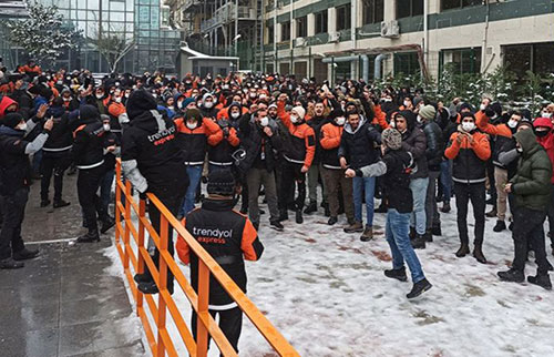 Nakliyat-İş Sendikasından yapılan açıklamada, “İstanbul’da Trendyol’da çalışan yüzlerce moto kurye, 2022 yılı için yapılan ve mart ayından itibaren uygulanacak olan %11 oranında ki ücret artışını protesto etmek için kontak kapatıyor.” denildi.