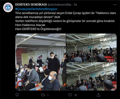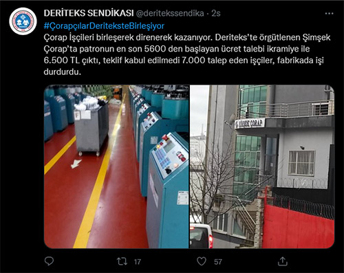 “Çorap İşçileri birleşerek direnerek kazanıyor. Deriteks’te örgütlenen Şimşek Çorap’ta patronun en son 5600 den başlayan ücret talebi ikramiye ile 6.500 TL çıktı, teklif kabul edilmedi 7.000 talep eden işçiler, fabrikada işi durdurdu.”