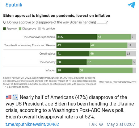 Washington Post- ABC News anketine göre ABD Başkanı Joe Biden'ın halk tarafından onaylanmama oranı yüzde 52. ABD'lilerin yüzde 47'si de Biden'ın Ukrayna meselesini ele alış tarzından memnun değil.