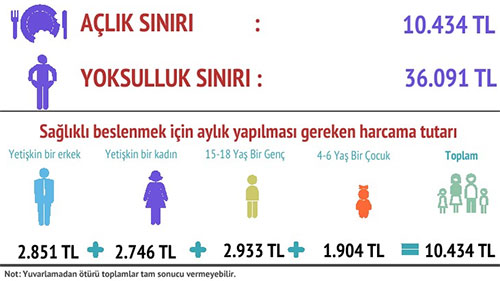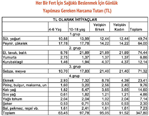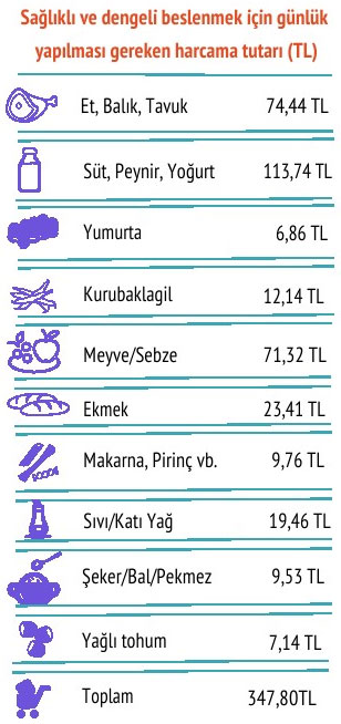 Sağlıklı ve dengeli beslenmek için her aile ferdinin alması gereken kalori miktarı farklılık göstermektedir. Yetişkin bir erkeğin sağlıklı ve dengeli beslenmesi için tüketmesi gereken gıdaların aylık karşılığı 2.851 liradır. Bu değer yetişkin bir kadın için 2.746, 15-18 yaş bir genç için 2.933, 4-6 yaş arası bir çocuk için 1.904 liradır. Sağlıklı bir biçimde beslenmenin toplam aile bütçesine maliyeti ise 10 bin 434 lira olarak tespit edilmiştir. Bu tutar söz konusu ailenin sadece gıda için yapması gereken zorunlu harcama tutardır. Eğitim, sağlık, barınma, eğlence, ısınma, ulaşım gibi giderler ile birlikte bir ailenin yapması gereken harcama tutarı 36 bin 091 liraya ulaşmaktadır.
